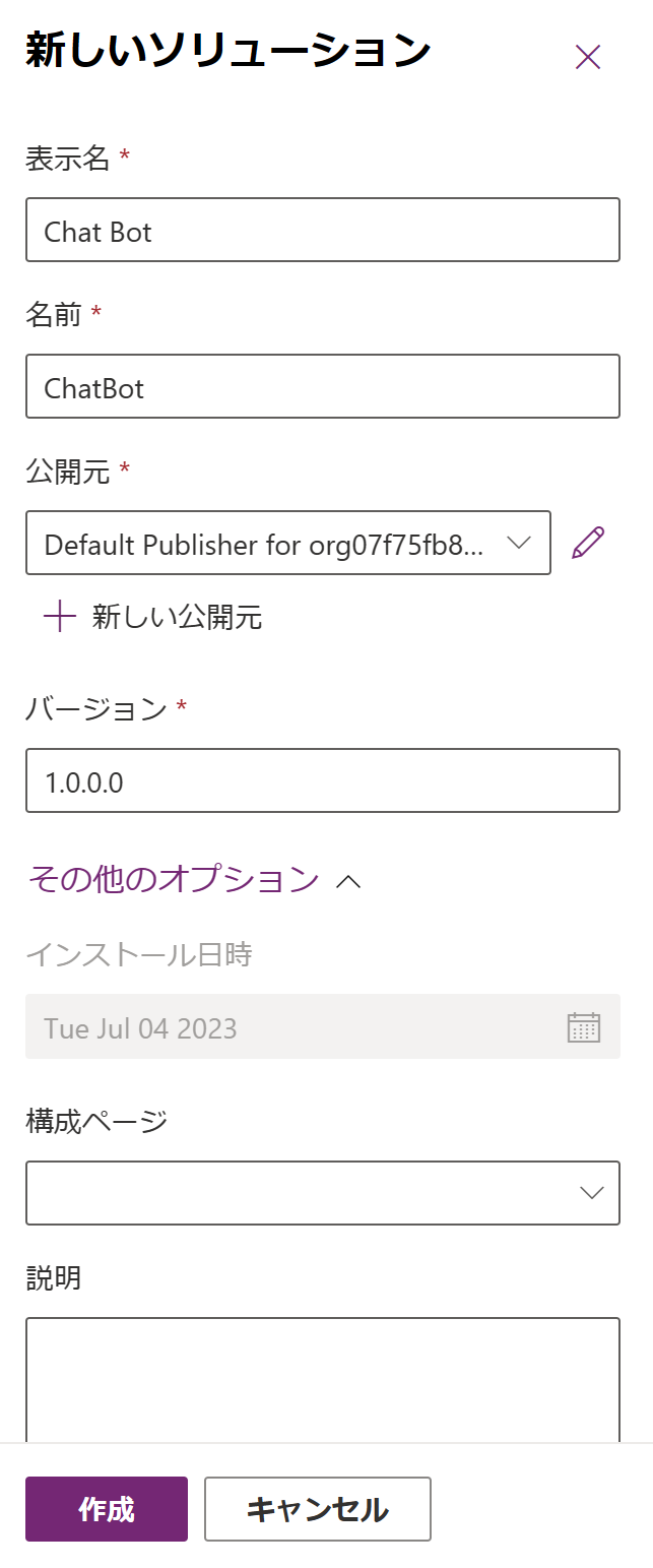 公開元 | こだわりがなければ、規定の発行者を選ぶことが多い | このソリューションの発行者の意味。作成したか、それ以外の人かで権限を設定することもできる。ここで設定するIDがコンポーネントの論理名の接頭辞になる。 |