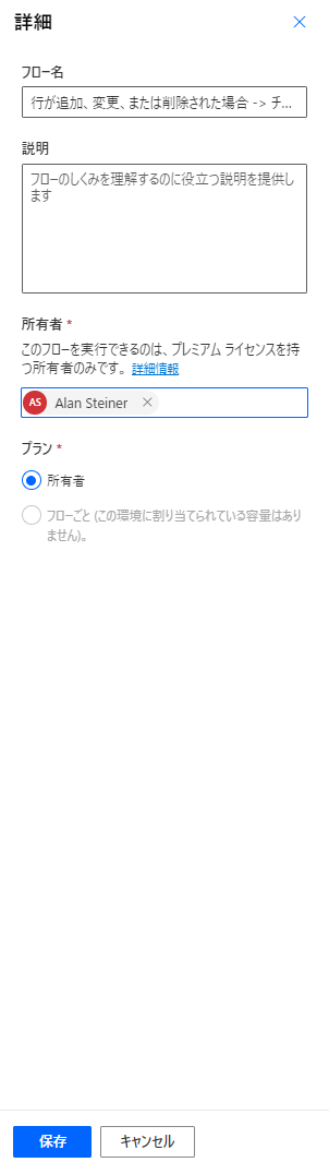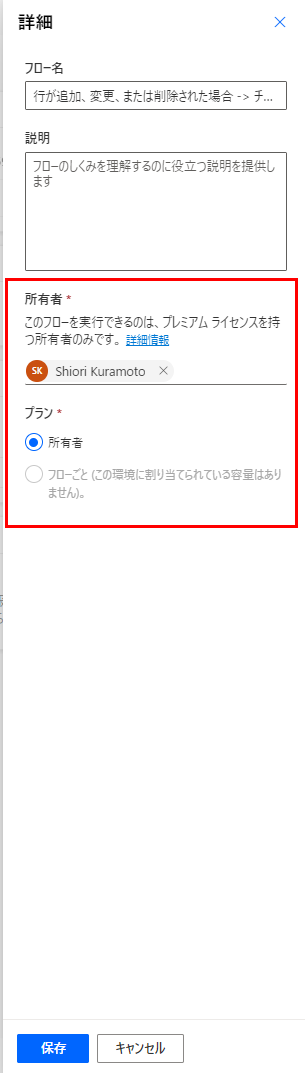 所有者のところに「非ソリューションフローのため、変更できない」旨が書かれています。