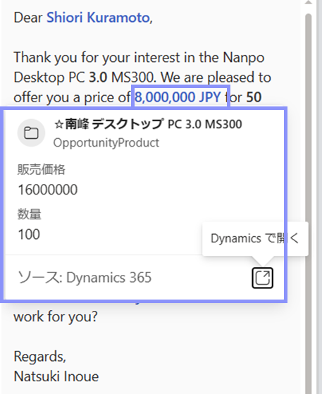 ❸はメールの文章の「南峰デスクトップPC3.0 MS300を50個」を認識し、CRMからその製品の価格を参照して、計算してくれています。