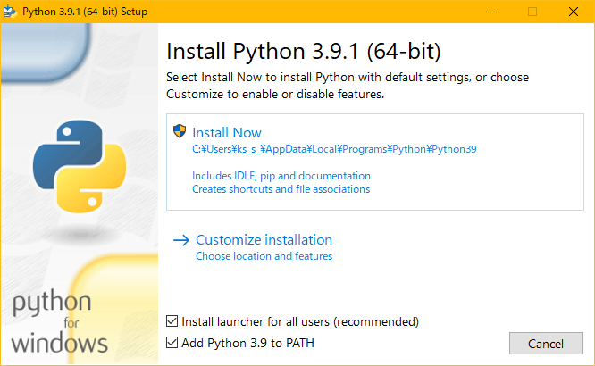 インストーラを起動。Add Python 3.9 to PATH を有効にしてPathを通します。
