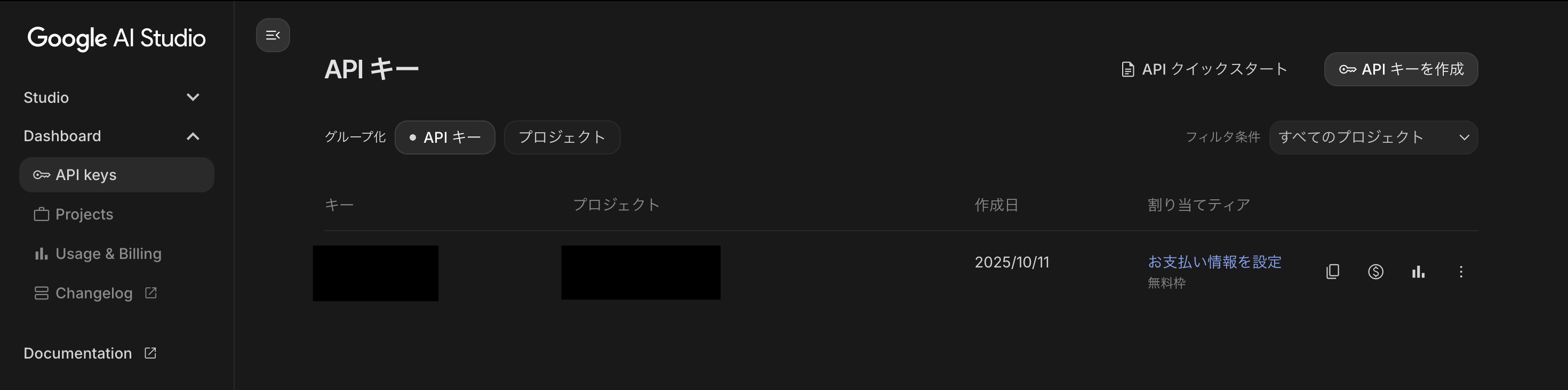 Google AI StudioからのAPIキー取得の詳細手順は割愛しますが、以下画像のように割り当てティアが無料枠となっていれば課金されないはずです。