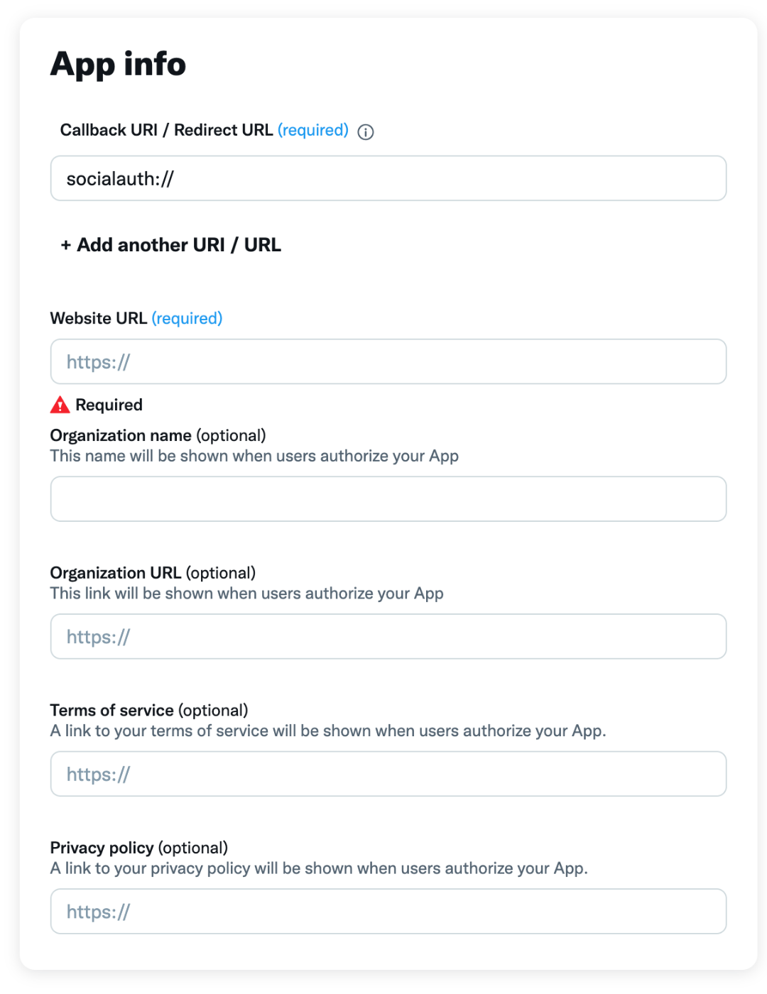 Twitter developerに登録しているアプリのApp InfoにリダイレクトURLとして[socialauth://]を設定します