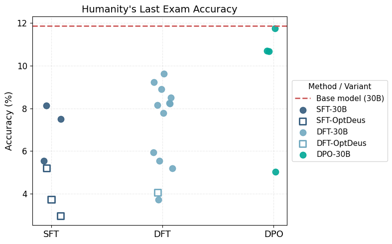 本プロジェクトでも、DFTを試行したところ、図1に示すようにベースモデルからは性能低下しているものの、SFTよりも高いHLEスコアを示す傾向が見られ、教師データへの過適合を緩和する効果が示唆されました。