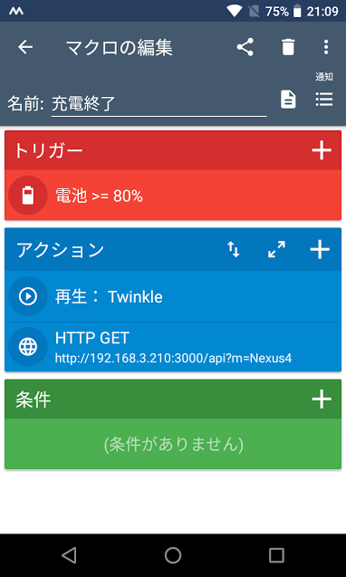 2.AndroidスマホにMacroDroid - デバイス自動化をインストールし、「電池>=80%」なら Webhook へ「機種名◯◯」を通知します。
