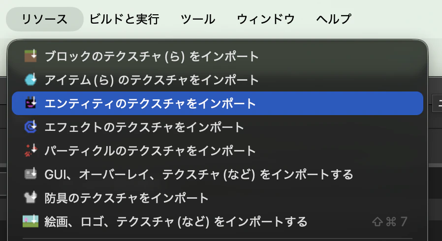 リソースメニュー → エンティティのテクスチャをインポートを選択して、hedgehog_texture.pngファイルを読み込みます。