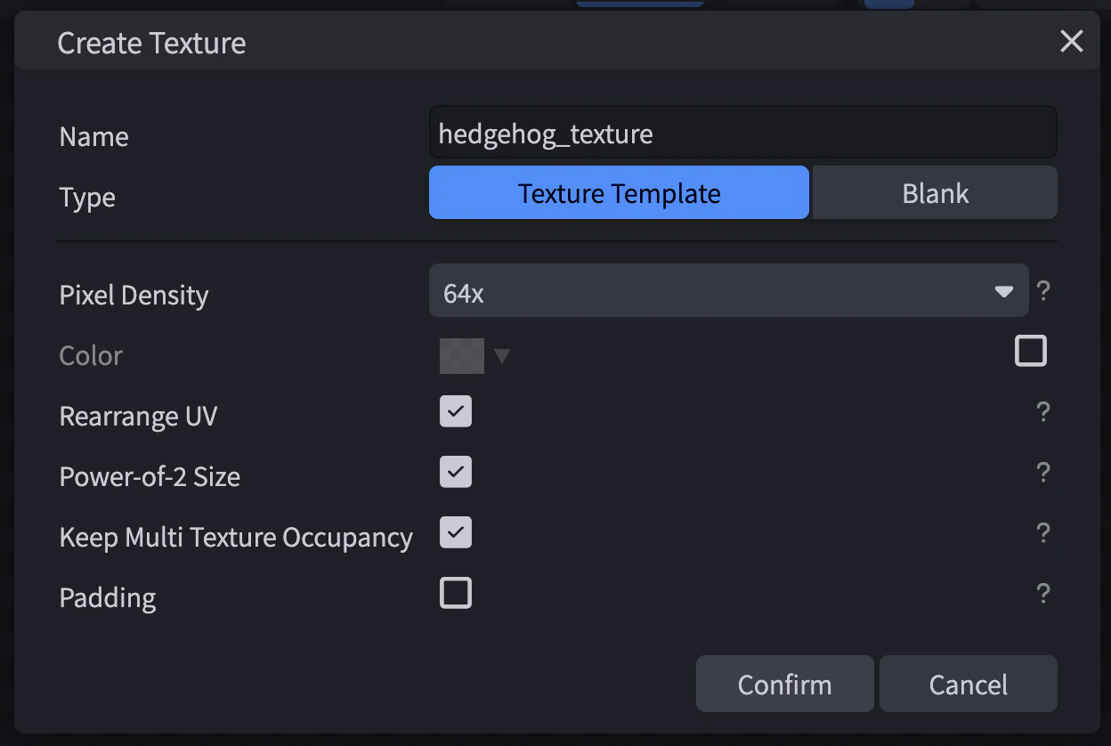 表示されるダイアログの、Nameを"hedgehog_texture"などの何のテクスチャか分かる名称(※全て小文字かアンダースコアにすること)にし、Pixel Densityは必要に応じて変えます(今回は64xを選択)。