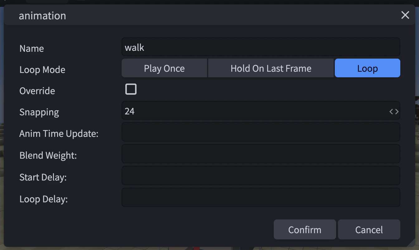 Nameには"walk"を入力し、Loop Modeは"Loop"を選択します。