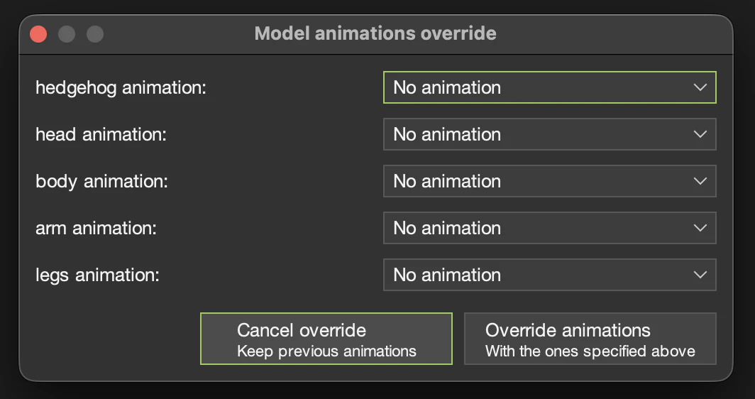 OUTLINERの"hedgehog"を選択し、今度はPositionの右の+ボタンを押して、次のようにキーフレームを設定すると移動時に飛び跳ねるアニメーションとなります。 - Fileメニュー → Export → Export Modded Entity Animationsを選択します。