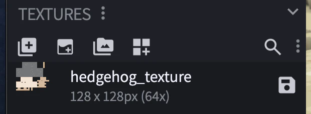 - テクスチャの横のフロッピーアイコンをクリックして、テクスチャをファイルに書き出します。名前は"hedgehog_texture.png"にします。