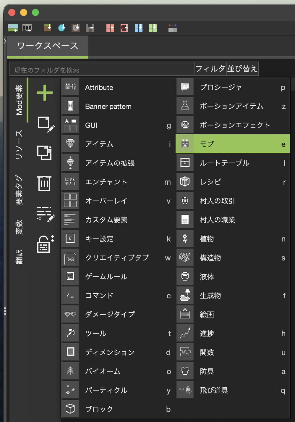 なお、読み込んだこれらのファイルは、ウィンドウの左側にある"リソース"タブの中に表示されます。削除はそこで行えます。 - モブを追加するために、"Mod要素"タブの左上の緑色の+ボタンを押し、"モブ"を選択します。