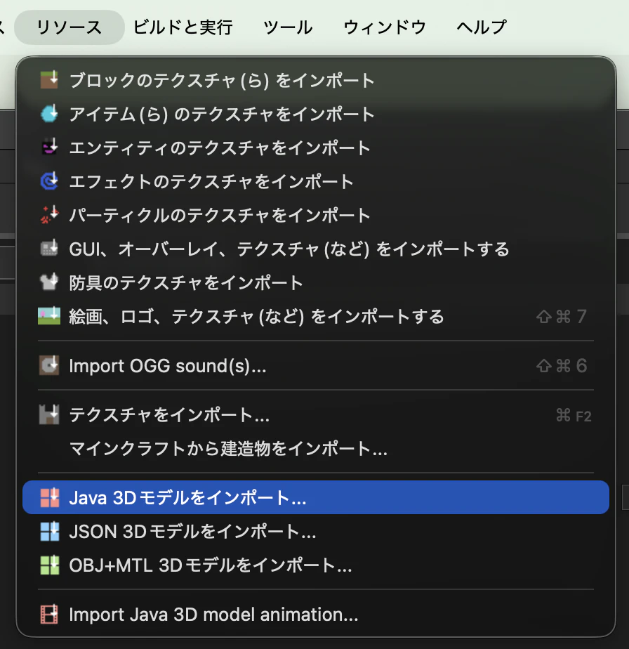 リソースメニュー → Java 3Dモデルをインポート...を選択して、Hedgehog.javaファイルを読み込みます。