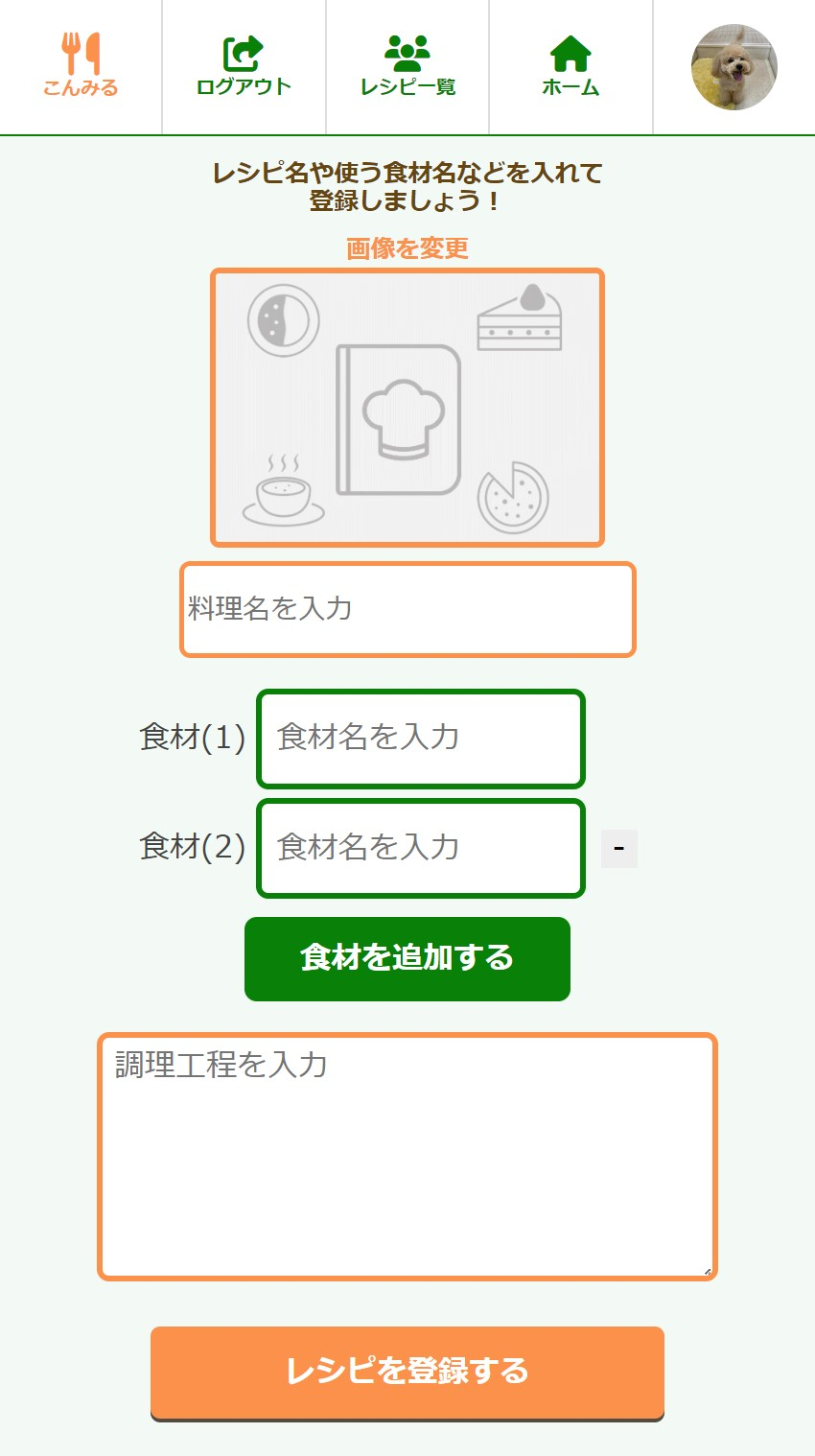 | レシピ名、写真、使う食材、 調理工程などのメモ欄、 これらを入力して登録します。 |