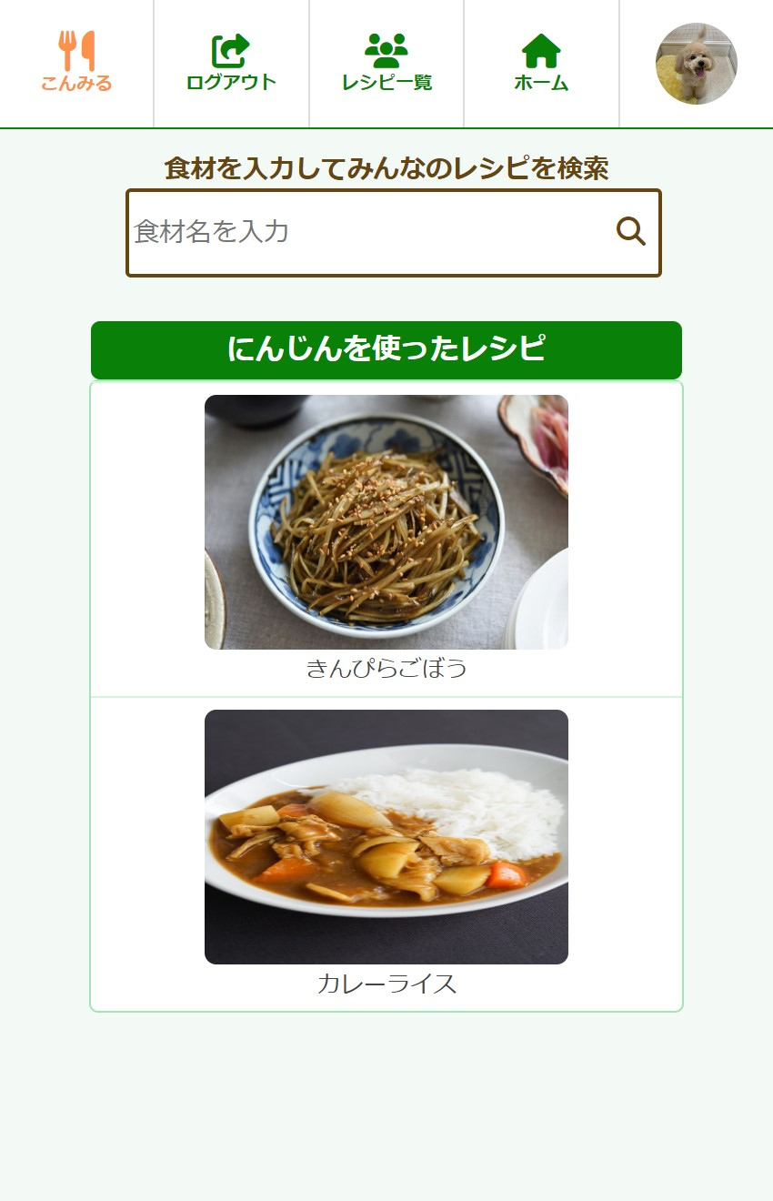 食材名が一致された レシピが一覧で表示されます。 |