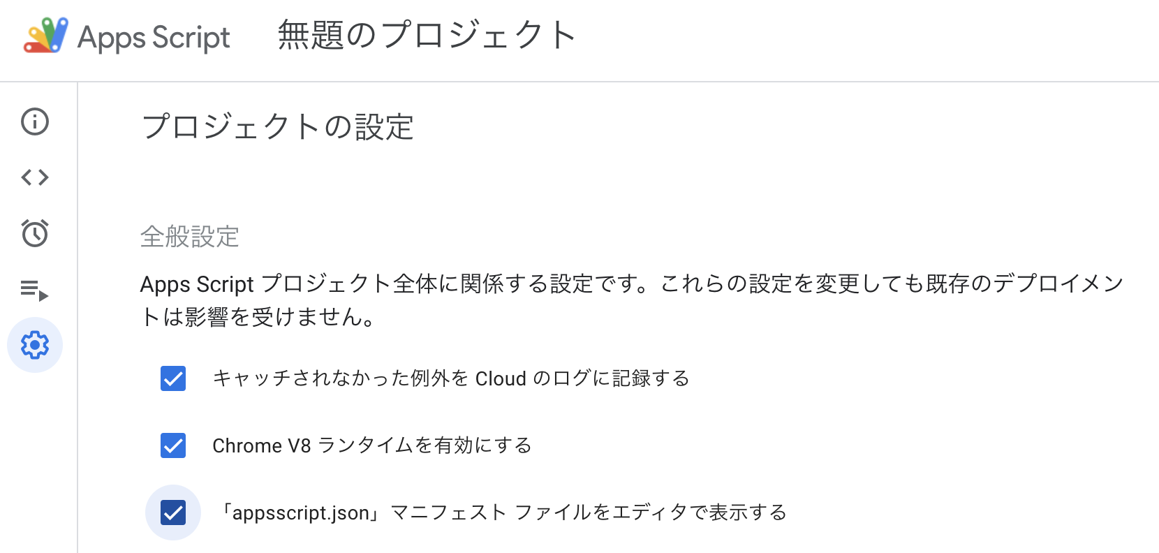 プロジェクトの設定を開いて、「「appsscript.json」マニフェスト ファイルをエディタで表示する」にチェックを入れます。