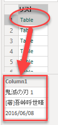 以下のように、複数の項目が1列になっているデータをテーブルにする方法の2番目です。
