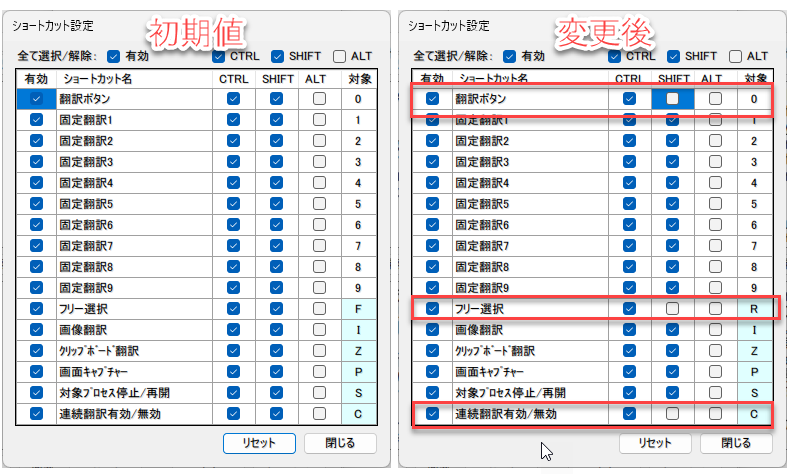 ショートカットの初期値は、CtrlとShiftの同時押しになっているので、よく使う「翻訳ボタン」、「フリー選択」、「連続翻訳有効/無効」はShiftキーを使わずに使えるようにしています。ただし、従来のショートカットとぶつかります。ALTキーと組み合わせるもいいのですが、「フリー選択」では「R」キーにアサインを変更しています。また、アルファベットのショートカットについては、キーを変更することもできます。