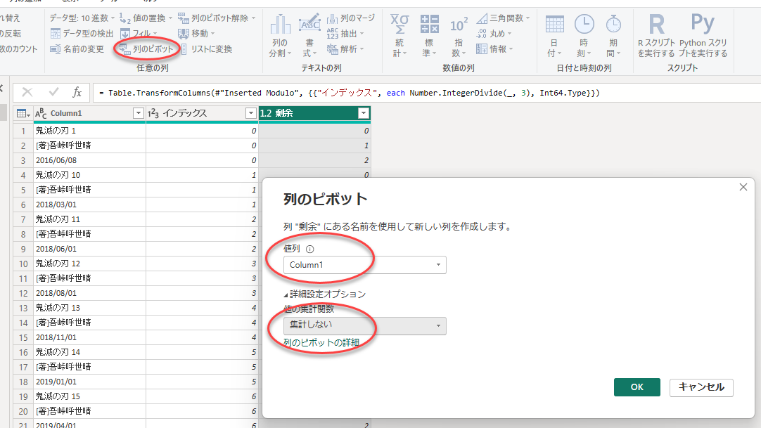 列見出しになる「剰余」列を選択し、「変換」タブで「任意の列」グループの「列のピボット」を選択します。「列のピボット」のダイアログが表示されますので、値列となる Column1 と、値の集計関数に「集計しない」を選択してOKを押します。