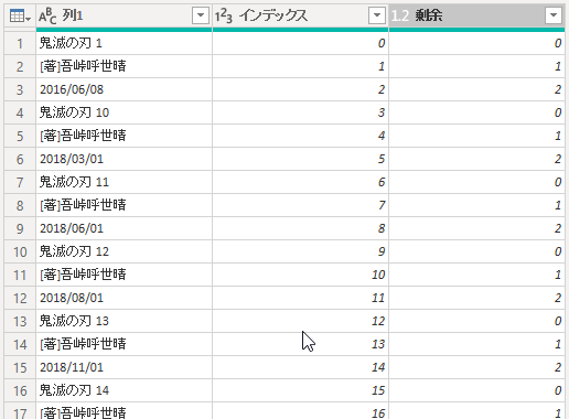RemovedColumns = Table.RemoveColumns(PivotedColumn, {"インデックス"}),