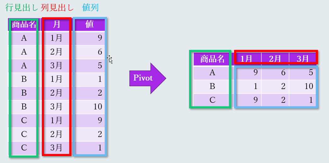 pivotValues には、列見出しとなる項目のリスト、 attributeColumn は列見出しとなる項目の列名を設定します。そして、 valueColumn は、値列の列名を設定します。また、 optional には、集計関数を設定します。