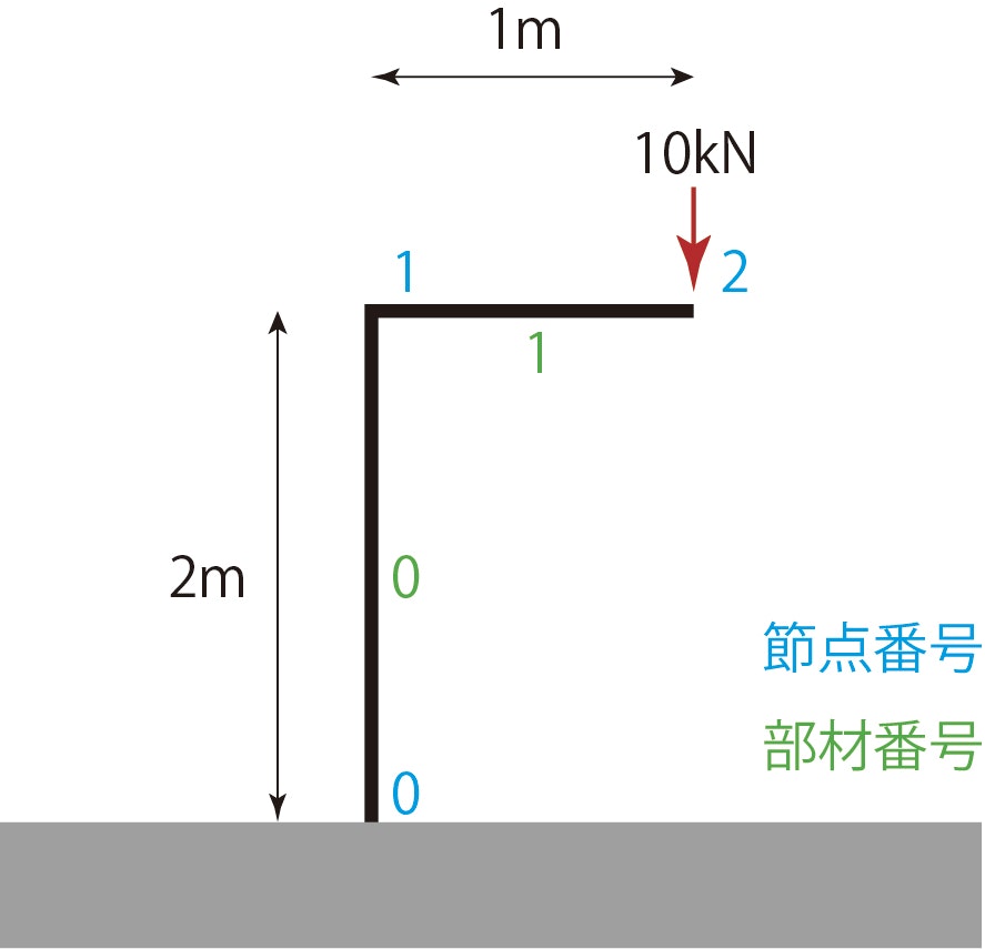 下の図のような節点0が固定端のL字のフレームの節点2に垂直下向きに$10\mathrm{N}$(図の$\mathrm{kN}\rightarrow \mathrm{N}$)の荷重が作用している.