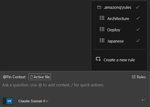 「context-management」Ruleが有効になっていることを確認したら、実際にAmazon Q Developerでチャットしてみましょう。