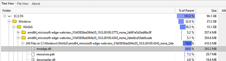 まず、何が容量を食っているのか突き止めることから始めました。WizTreeという無料ツール(おすすめです!)を使ってみると、すぐにC:\Windowsフォルダが約34GBと判明。更に詳しく見ていくと、その約半分、およそ15GBがC:\Windows\WinSxSディレクトリに占められていました。WinSxSの中には、amd64_microsoft-edge-webview_xxxxという名前のフォルダがいくつかあり、これが特に気になりました。
