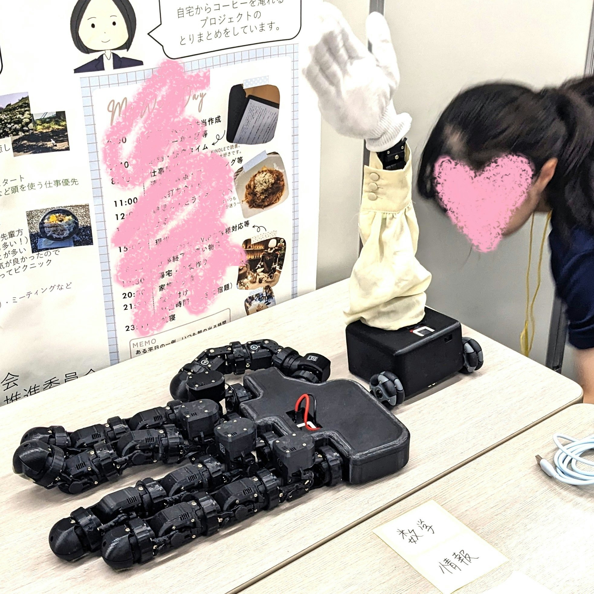 ちなみに、奥においてあるのは、SO101でテレオペレーションの体験です。 また、現役の大学院生の方の研究しているハンドロボットも展示していました。都内の中高一貫校でWS