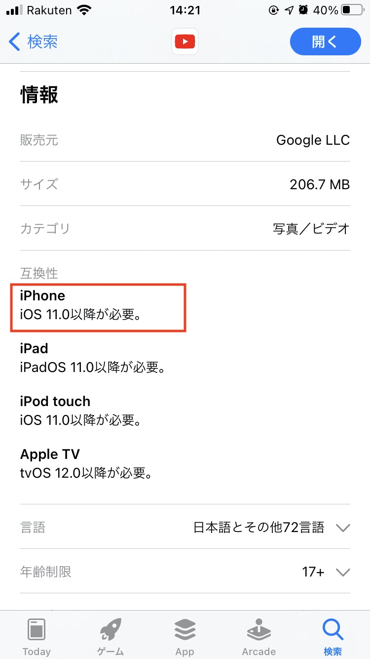 iPhone で「App Store」>「適当なアプリ選択」>「情報」>「互換性 - この iPhone に対応」から対応している OS を確認できます。