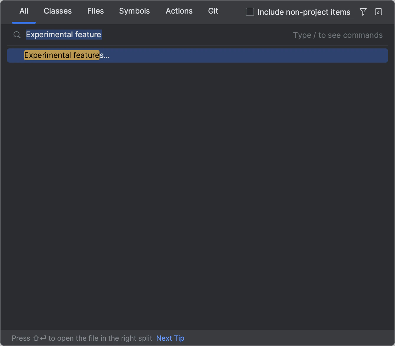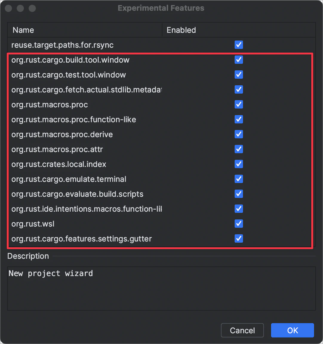 次に、Experimental featureでorg.rustで始まるもの全てにチェックを入れる必要があります。これは、IntelliJ系のIDEでRustを完全に使うために必要な設定です。IntelliJ IDEAの場合、メニューバーから「Help」をクリックし、「Find Action」を選択して、ポップアップウィンドウに「Experimental Features」と入力します。