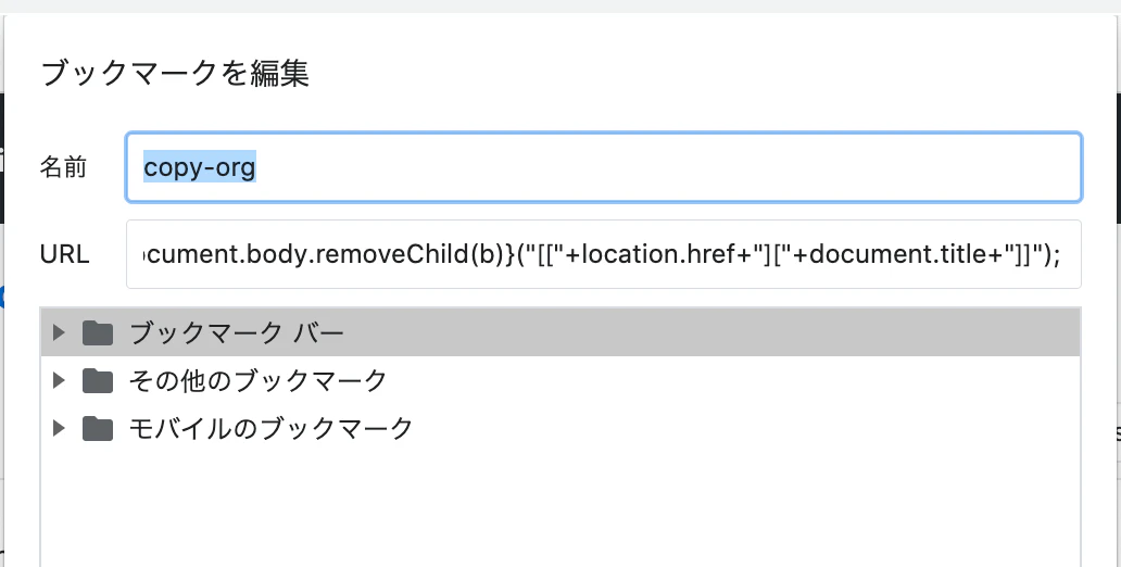 javascript:!function(a){var b=document.createElement("textarea"),c=document.getSelection();b.textContent=a,document.body.appendChild(b),c.removeAllRanges(),b.select(),document.execCommand("copy"),c.removeAllRanges(),document.body.removeChild(b)}("[["+location.href+"]["+document.title+"]]");