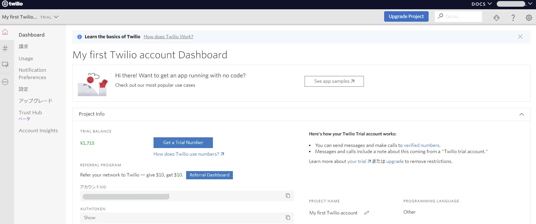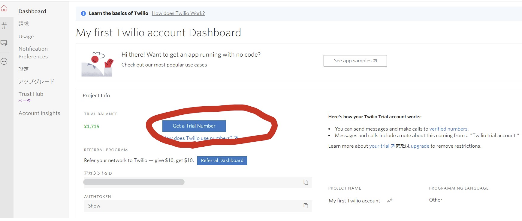 コンソールのダッシュボードに戻ったらトライアル用の電話番を取得します。