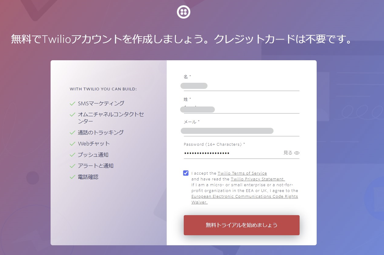 無料サインアップから進んで。必要情報を入力します。カード情報は必要ありません。