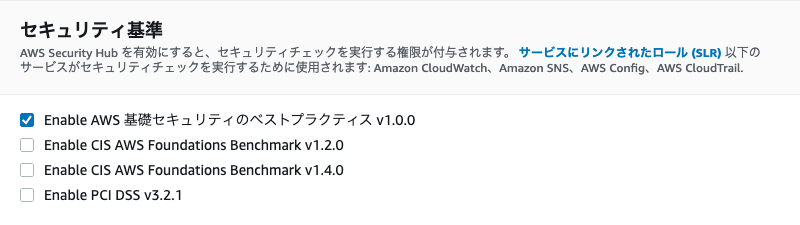 AWSが提供するセキュリティ標準のうち、チェックを行うものを選択します。これは後で変更することができます。迷ったらまずはAWS基礎セキュリティのベストプラクティスを有効にすると良いでしょう。