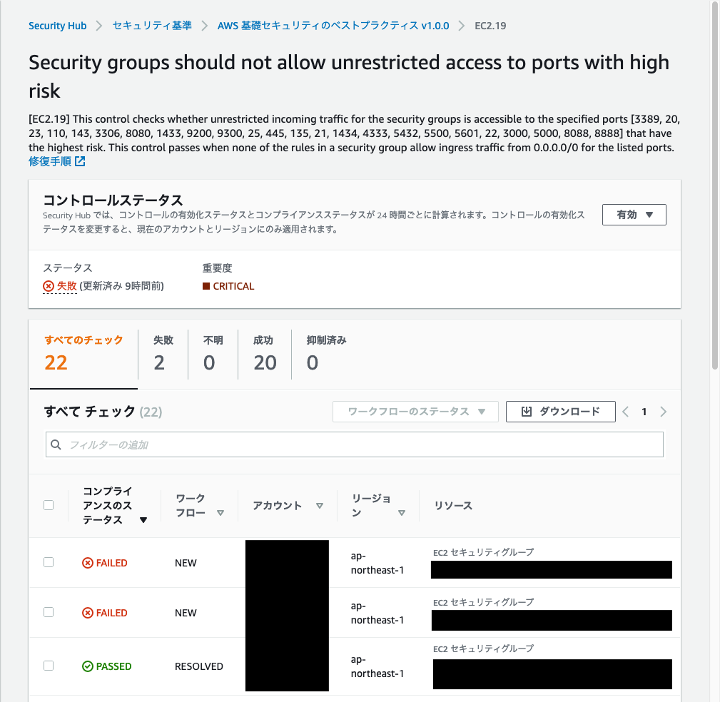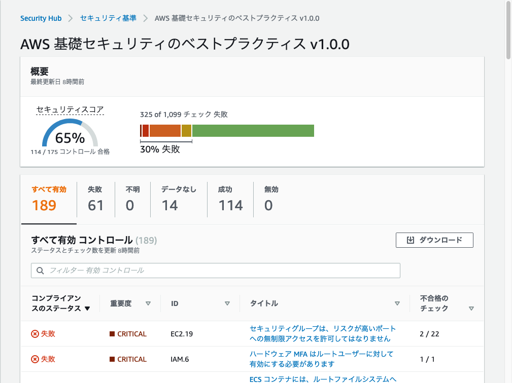 まず、コンプライアンスのステータスが失敗となっていて、項目の重要度が高いもの(CRITICALやHIGH)のものから対処していくと良いでしょう。