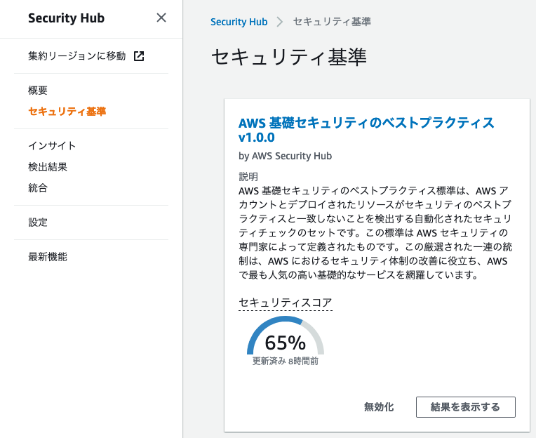 コンソール画面のセキュリティ基準から、各セキュリティ標準のセキュリティスコアを確認することができます。結果を表示するをクリックすると、各項目についての結果を確認することができます。