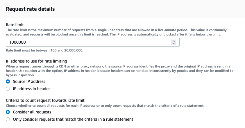 AWS WAFを使用して、高いレートでリクエストを送信するIPアドレスを検出することができます。具体的には、5分間あたりのリクエスト数の上限を設定し、それを超えるリクエストを送信したIPアドレスからのトラフィックを検出します。これは、DDoS攻撃や、高いレートでリクエストを送るBot攻撃の緩和に役立ちます。