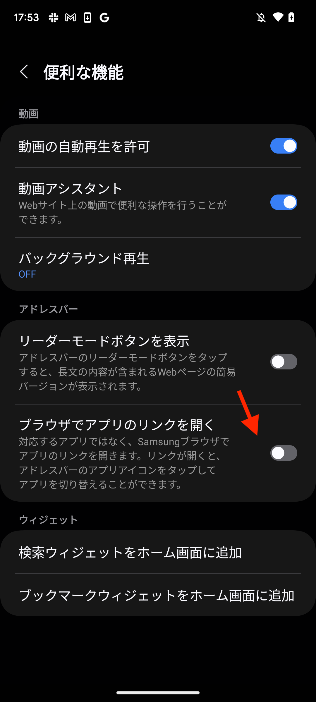 Samusung端末にデフォルトで入っているInternet BrowserやArc Searchではディープリンクの機能が発火せずブラウザへ遷移してしまいました。Internet Browserについては画像のようにブラウザの設定である「ブラウザでアプリのリンクを開く」をオフにすると(デフォルトではオンだった)遷移させたいリンクでディープリンクを発火させることができました。