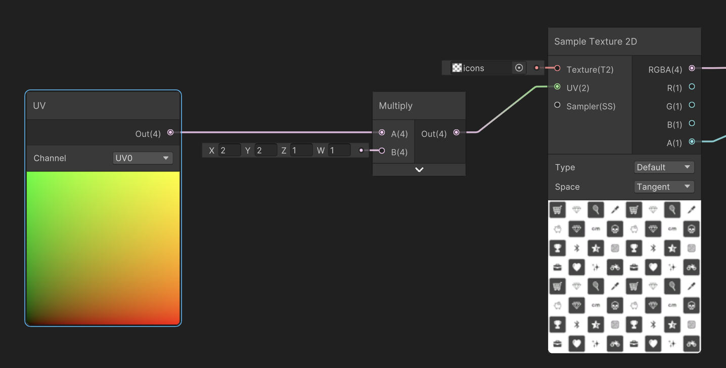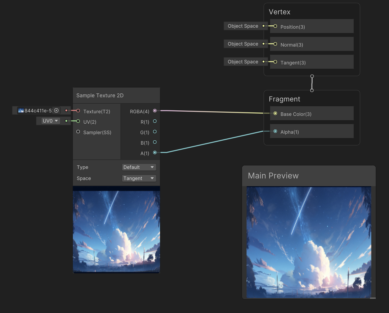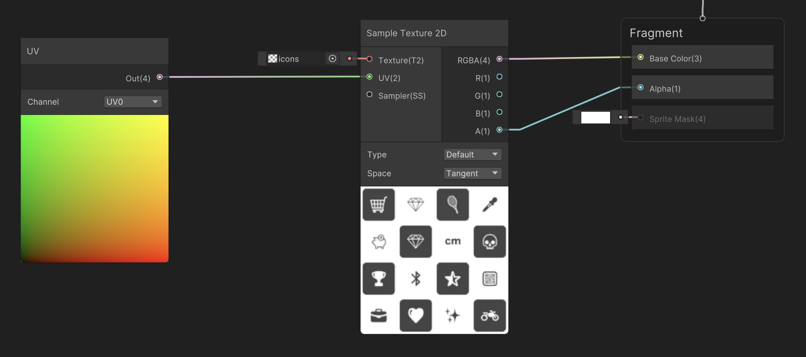 2Dに限らずシェーダー全般において、基本的には、UV〜テクスチャ、テクスチャ〜出力までの間で必要なノードを追加することで該当の挙動のシェーダーを作成していきます。