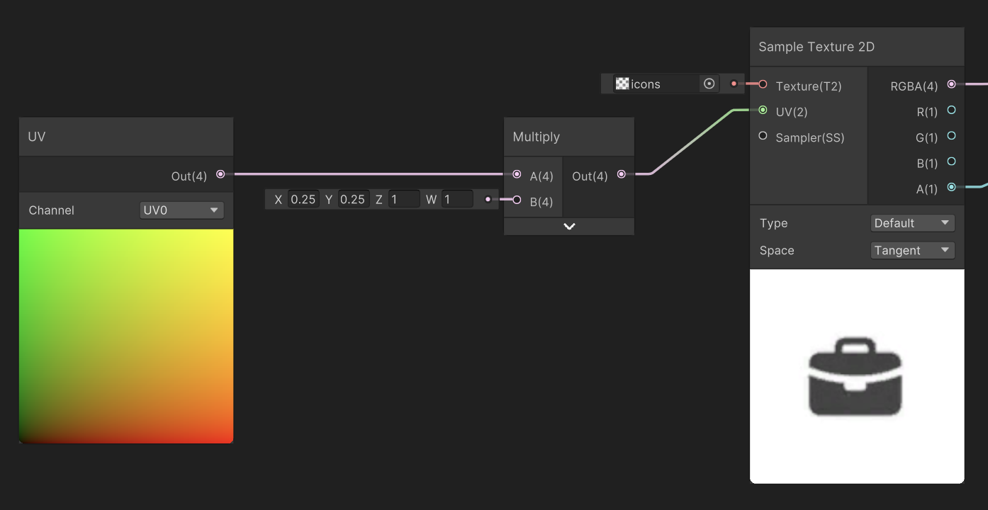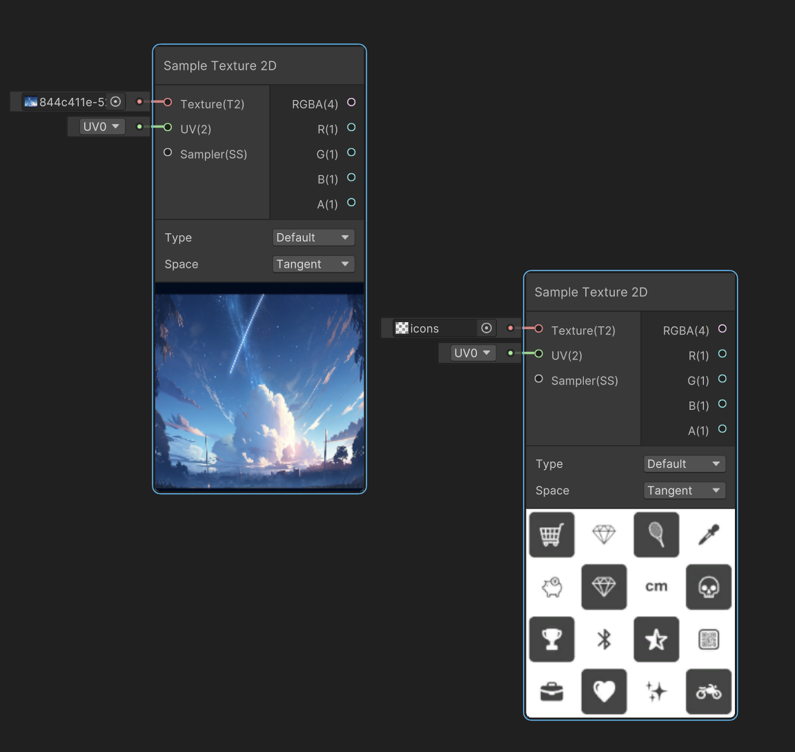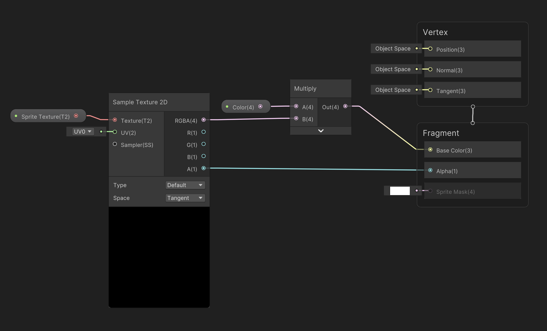 2Dに限らずシェーダー全般において、基本的には、UV〜テクスチャ、テクスチャ〜出力までの間で必要なノードを追加することで該当の挙動のシェーダーを作成していきます。