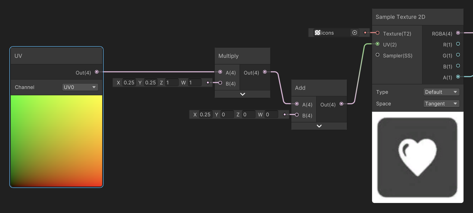 - 上記のノードの Multiply の後 X軸に 0.25 を足すと隣のハートが表示される