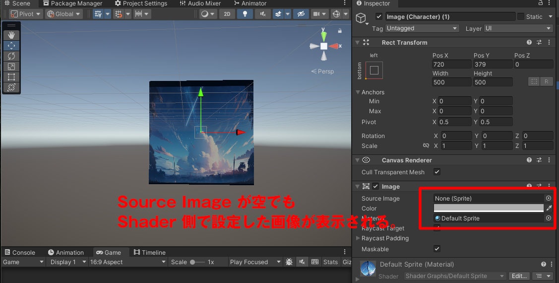 実際に Image コンポーネント上でこのマテリアルを貼り付けると、Source Image を無視して、Shader 側で設定した画像がそのまま表示される。