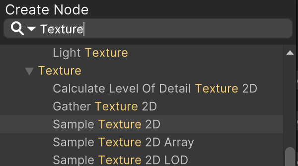 ワークスペースで右クリック → Create Node を選びメニューから Simple Texture 2D を選択する(検索窓が便利)。