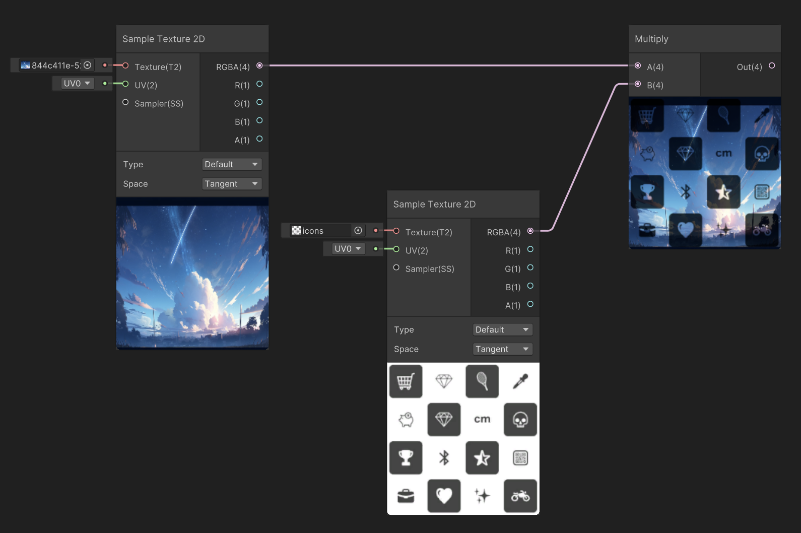 - 2つのテクスチャノードを Multiply ノードで結ぶと、画像の乗算合成が出来る