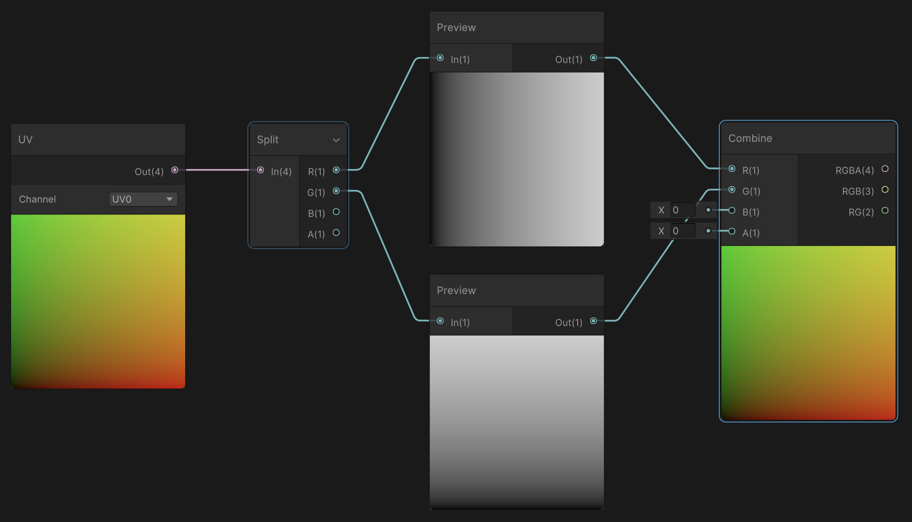 - UV を分割すると、それぞれ X軸、Y軸に対して0(黒)〜1(白)までグラデーションがされていることを確認できる