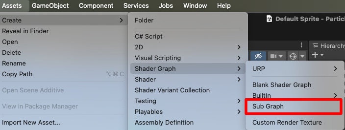 Project ウインドウの任意の場所(Shadersフォルダ内が望ましい)で右クリック(or Assets メニュー) → Create → Shader Graph → Sub Graph を選び、Shader ファイルを作成