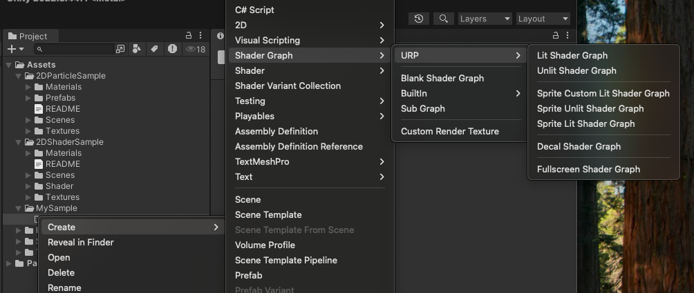 まず、Unity を開き Project ウインドウの任意の場所(Shadersフォルダ内が望ましい)で右クリック(or Assets メニュー) → Create → Shader Graph → URP → Sprite Unlit Shader Graph を選び、Shader ファイルを作成