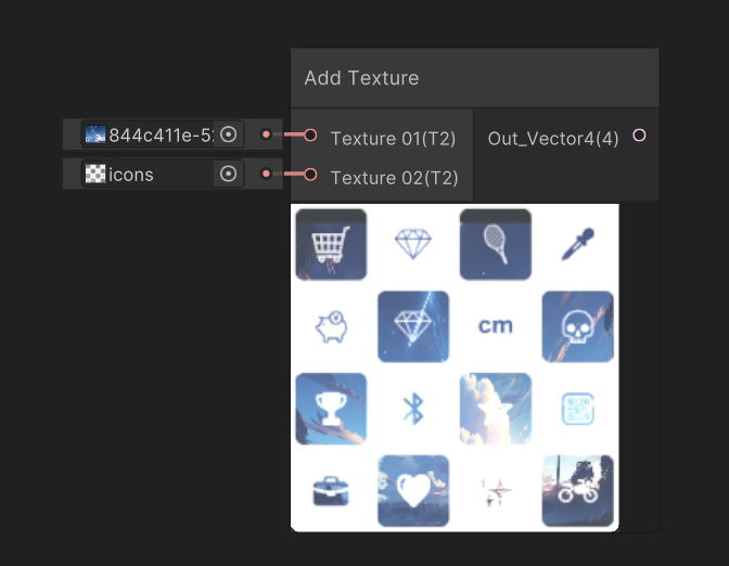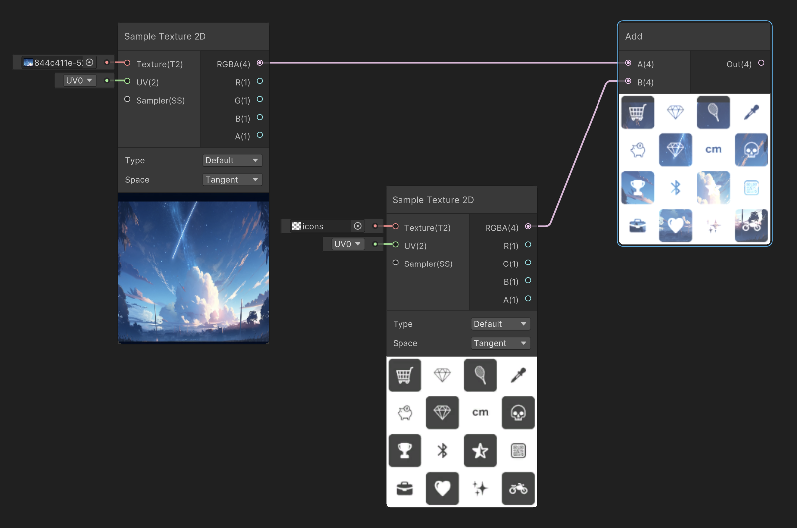 - 2つのテクスチャノードを Add ノードで結ぶと、画像の加算合成が出来る