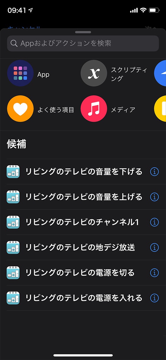 6、「アクションを追加」をタップします。ショートカットで利用可能な直前までの操作が表示されますので、候補の中から「リビングのテレビの電源を入れる」をタップします。