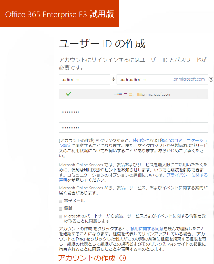 ユーザ ID の作成 とありますが、この画面で指定する@マーク以下 xxxxx.onmicrosoft.com が Azure AD のドメイン名になります。この値はグローバルで一意な値となります。