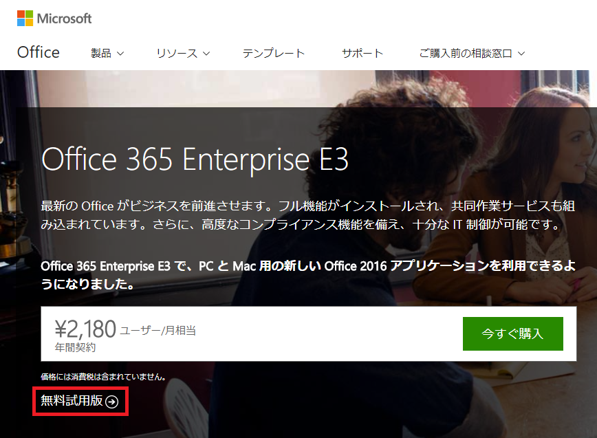 Office 365 はいくつかの価格体系がありますが、2018 年 3 月現在でメジャーな価格体系である Office 365 E3 で試してみます。下記URL から試用ができます。